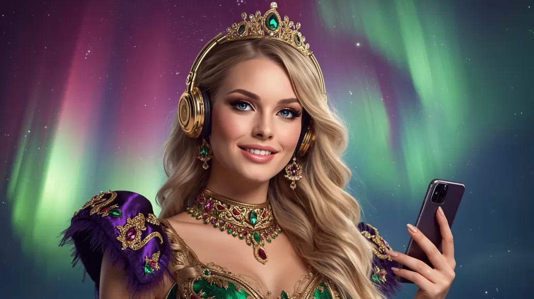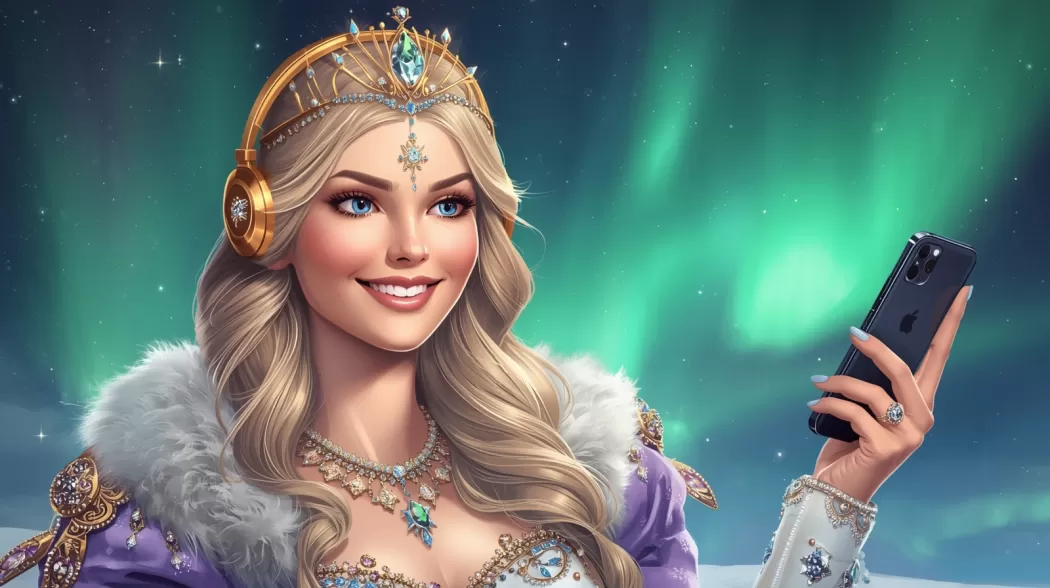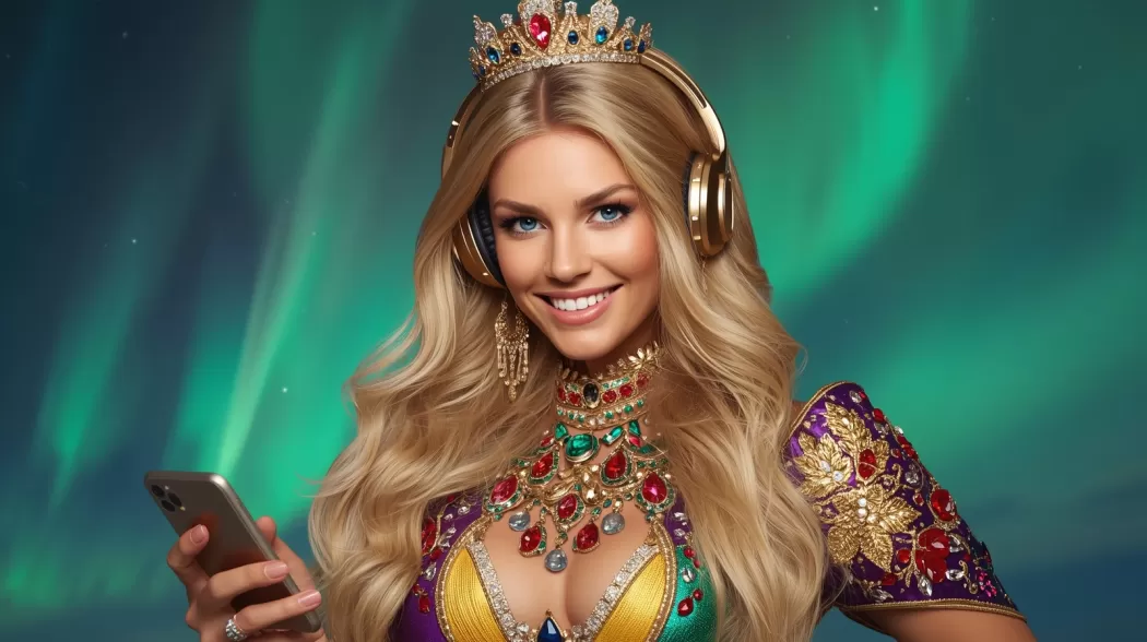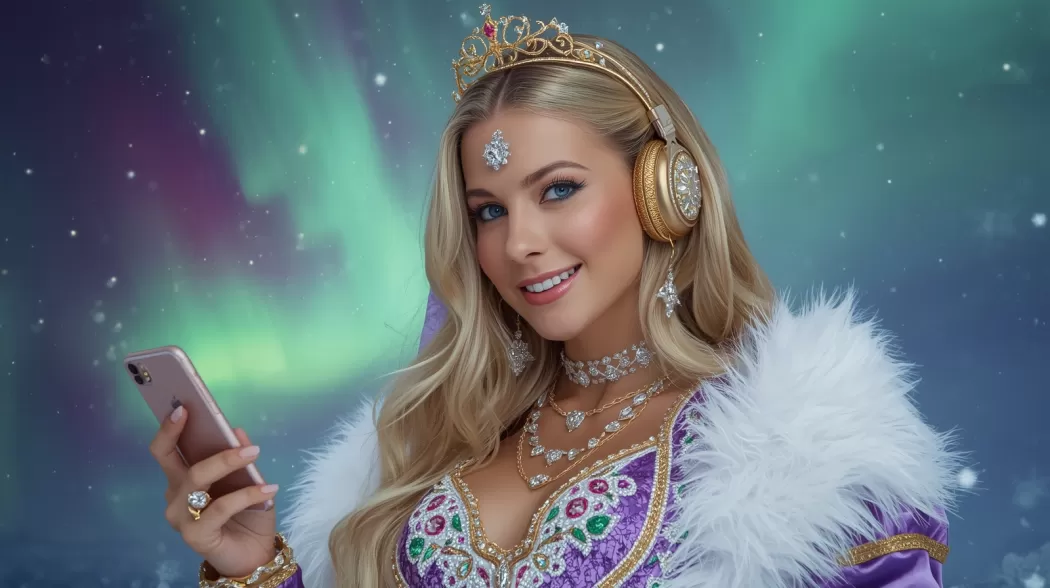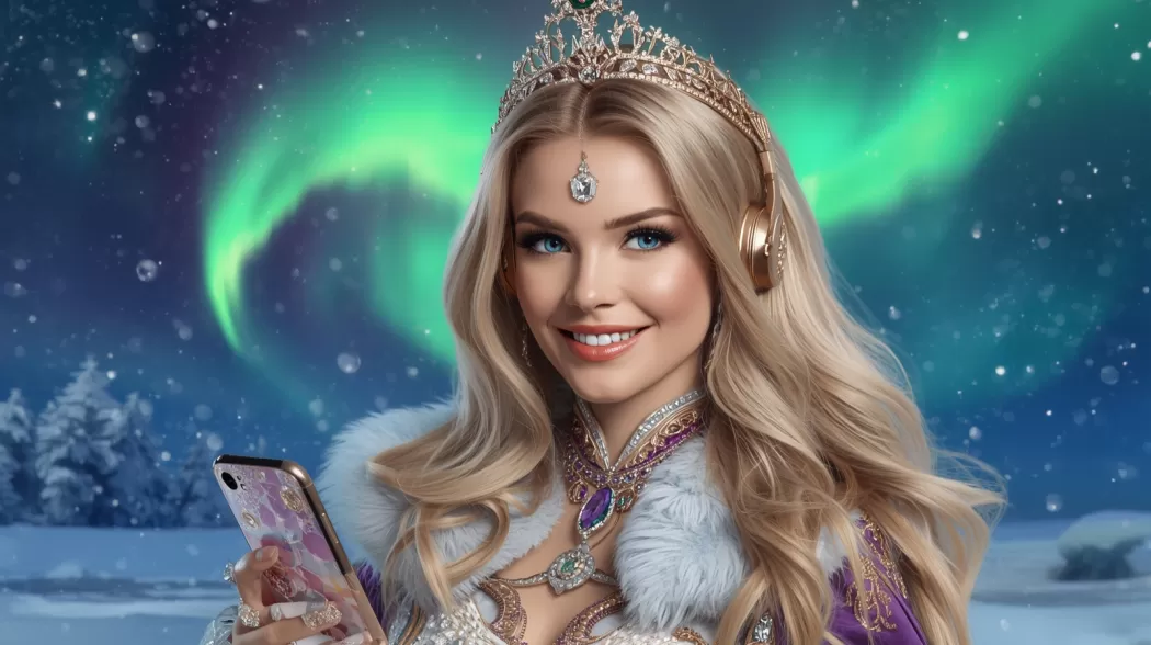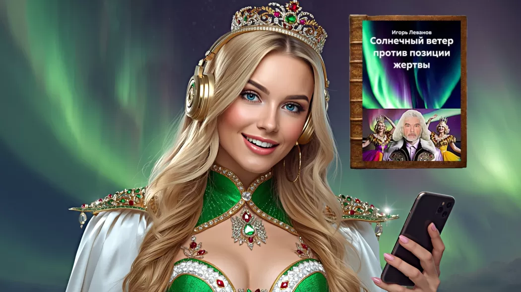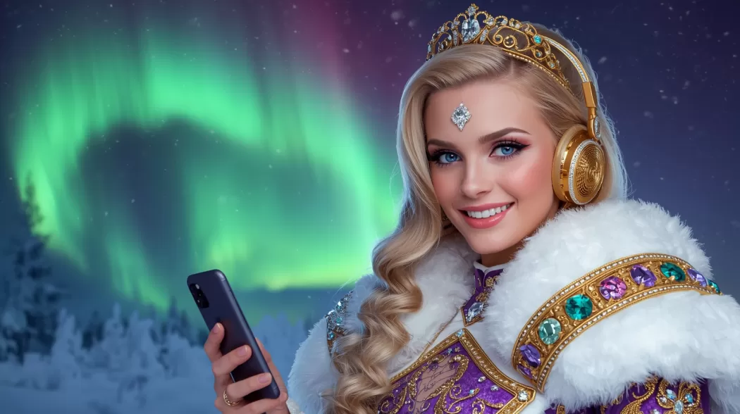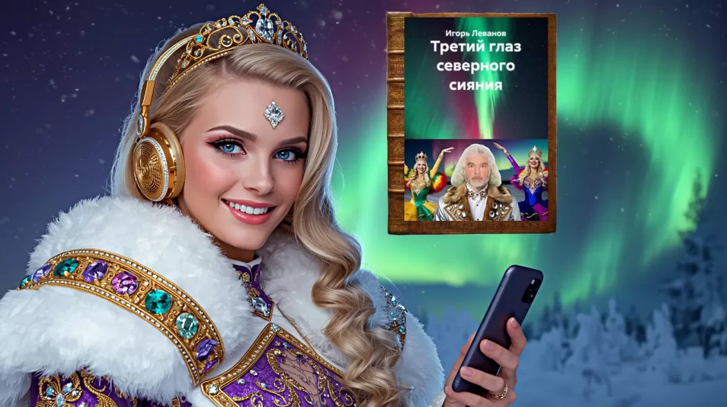 Свет вошёл не через дверь. Он пришёл в виде ленты северного сияния, которую кто‑то растянул поперёк комнаты и закрутил в вуаль. Из вуали вышла Королева северного сияния — не фигура, а движение: плащ её переливался зелёными и пурпурными полосами света, голос был лёгок как ветер, в котором слышалось далёкое солнце.