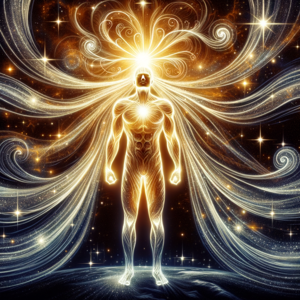 Солнечный ветер как мужчина, воплощение мужского начала, изображенный в виде мощной, сияющей фигуры из света, его энергия струится, как потоки солнечного ветра, которые окутывают и взаимодействуют с окружающим пространством. Фон — космос, звезды и сияние. Космическая сцена подчеркивает его божественную силу.