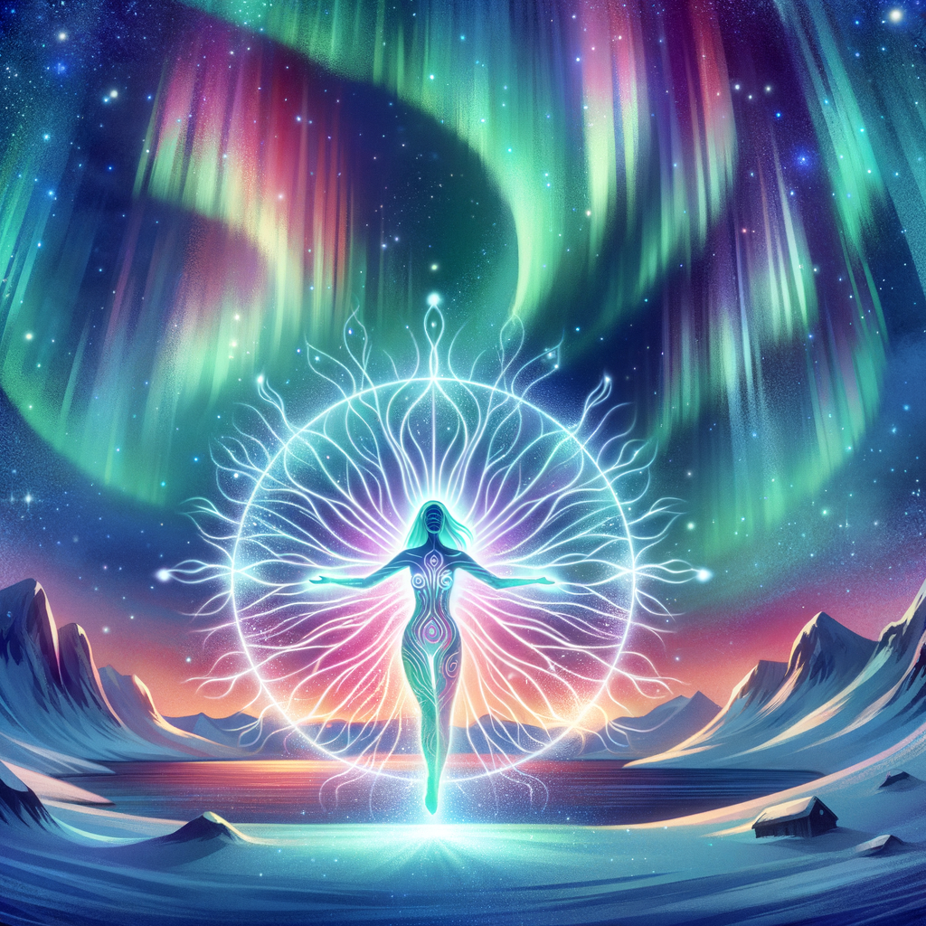 Северное сияние как женщина, воплощение женского начала, изображенная в виде танцующей, переливающейся светом фигуры, её движения мягко сливаются с переливами полярного сияния. Фон — ночное небо Арктики, звезды и снежные вершины. Мистическая сцена подчеркивает её связь с природой и духом.