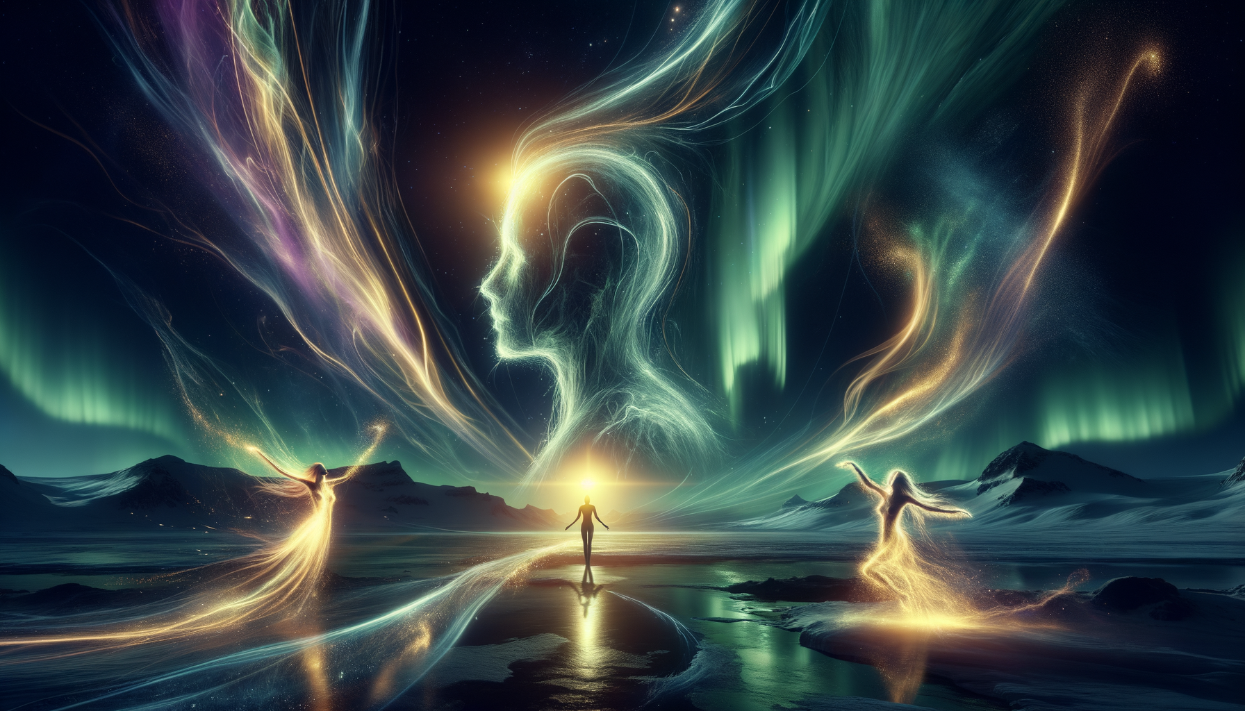 Кинематографичная композиция с северным сиянием. По центру — полупрозрачный светящийся человеческий портрет‑силуэт, символизирующий солнечный ветер: струящиеся линии, как потоки плазмы и силовые линии магнитного поля, золотисто‑белое излучение, тонкая корона света вокруг головы. По бокам — две танцующие женщины‑музы, олицетворение танцующего северного сияния: длинные струящиеся платья из света и тумана, оттенки изумрудного, фиолетового и бирюзового, динамичные движения, лёгкое размытие движения. На заднем плане — эпическое ночное небо с ярким северным сиянием, лучи и занавеси света, арктический пейзаж внизу, лёгкое отражение на снегу или воде. Светотень драматичная, контрастная, интенсивное свечение, выраженный рим‑лайт. Символика: тонкий звёздный крест или сияние в области сердца центральной фигуры; едва заметные дуги магнитосферы вокруг. Настроение — священное, вдохновляющее, гармония мужского и женского начал. Без текста и логотипов, реалистичный стиль с оттенком мистики.