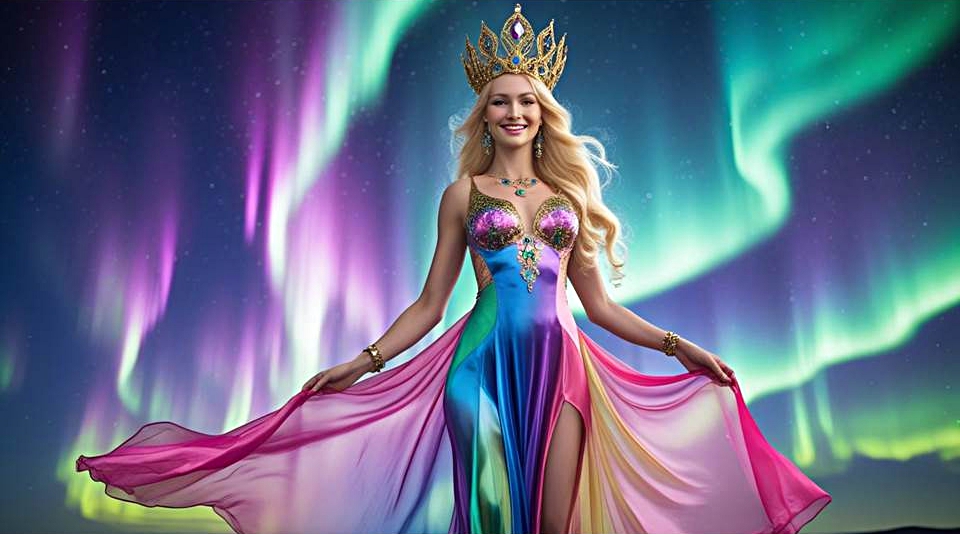 Представьте, что танцующая девушка — это воплощение северного сияния. Она грациозно и уверенно движется, её движения плавны и налево, словно олицетворяют огни, парящие в воздухе. Каждый её шаг наполняет пространство светом и атмосферой. Костюм, сверкающий как само сияние, переливается всеми цветами, накрепко соединяя элементы природы и искусства.